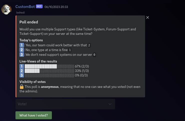 • If enabled: Exact time at which the poll will expire (controlled by the duration option in the command) and whether the poll has ended
