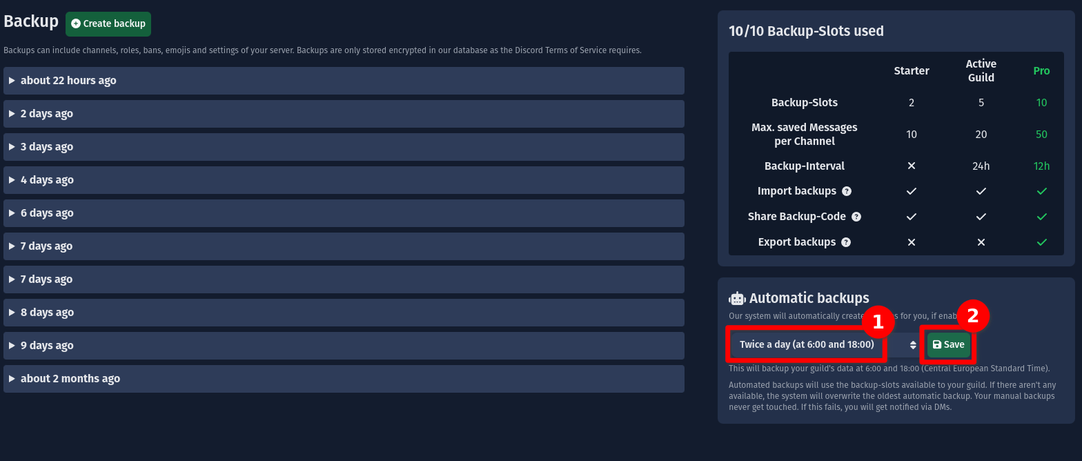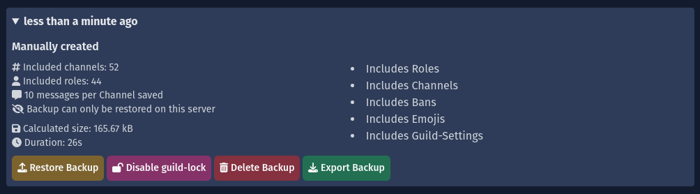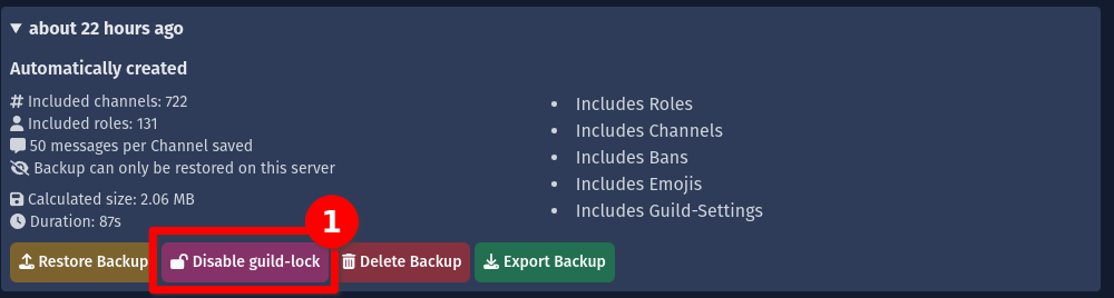 • Disable / enable Guild-Lock: Allows / Disallows your Backup to be restored on other servers. Please read more in the restore backups on other servers section.