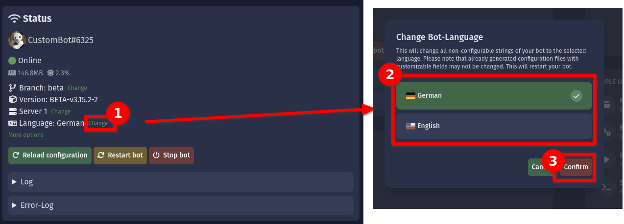 • "Restart bot": This restarts the process of your bot. This might take multiple minutes and involve a high downtime, in which your bot is unreachable. You should only restart your bot if you get asked to do this, are experiencing weird issues or want to apply an update.